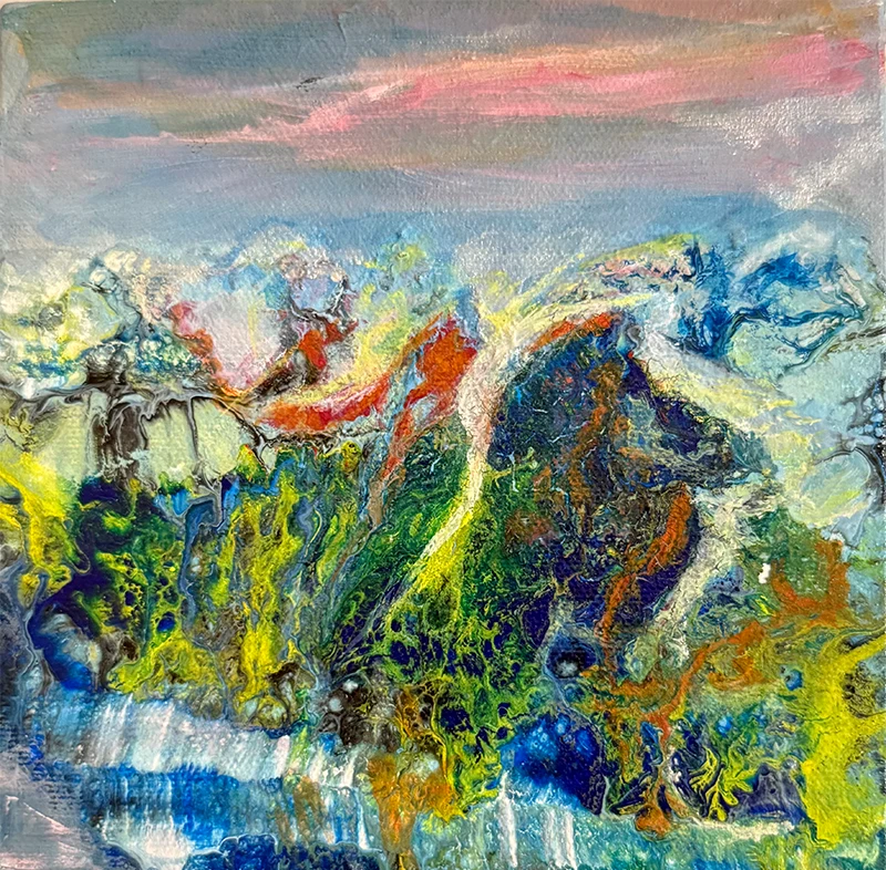 This mixed-media painting shows several layers, rich textures, dark shadows, bright colours, and a touch of gold here and there. These are the stages of life - the transitions that we go through. Each stage has its own beauty. Without darkness we wouldn't appreciate the brilliance of light and vice versa.